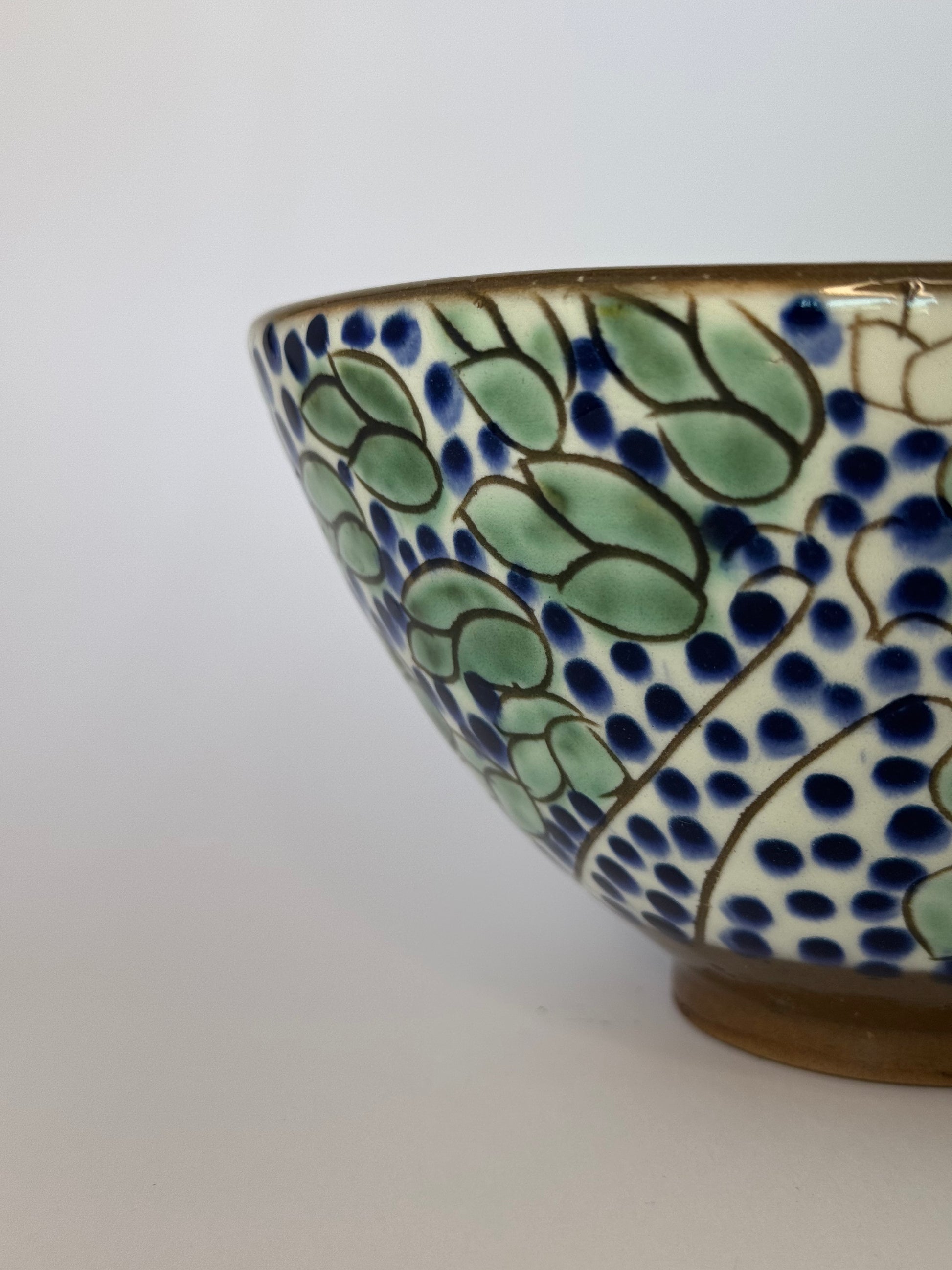 Handmade ceramic round bowl from Fayoum, Egypt. This one-of-a-kind hand made piece shows dates and leaves from the Fayoum area in blues and greens on an off white background. No two pieces are alike.