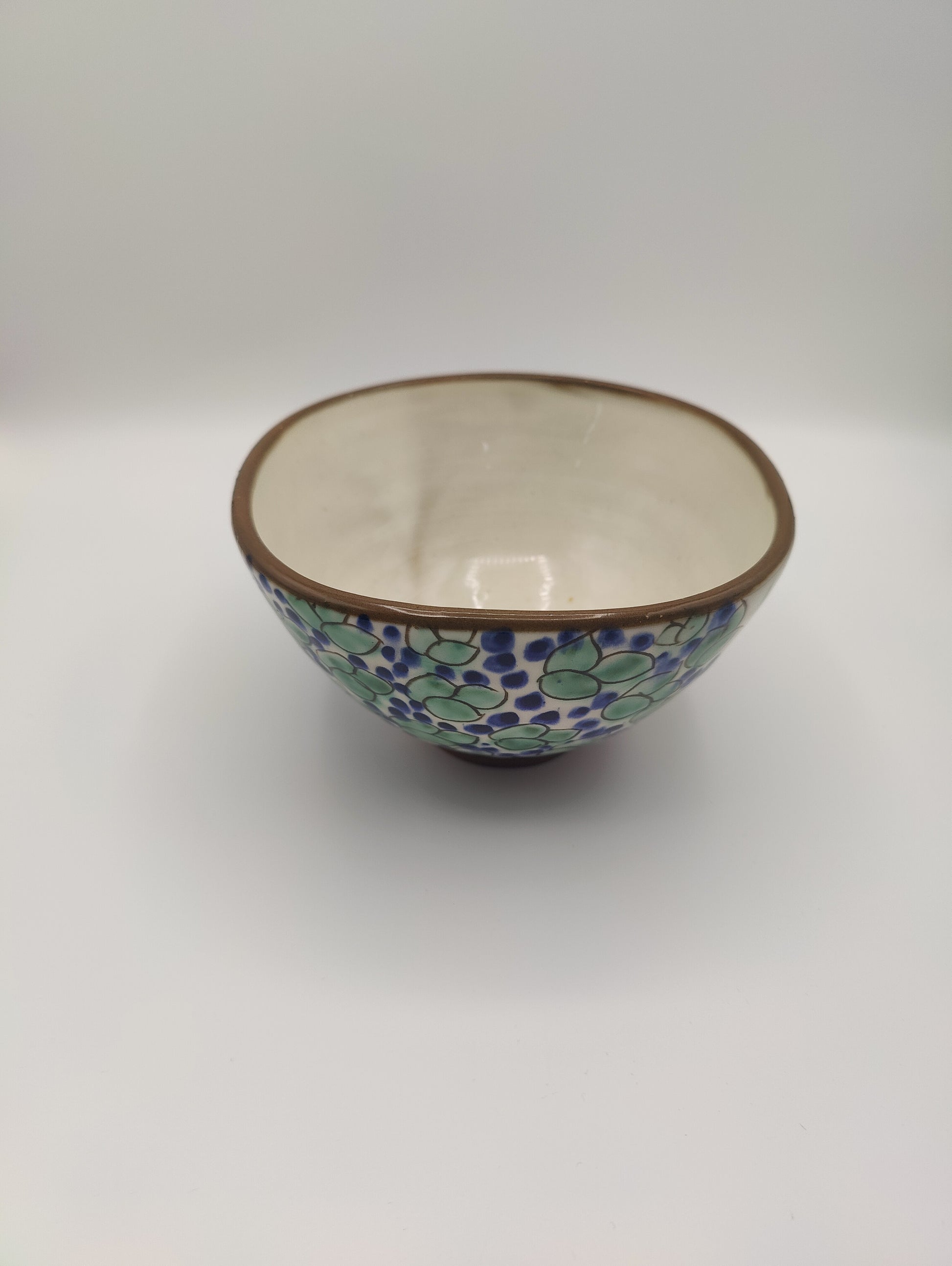 Handmade ceramic square bowl from Fayoum, Egypt. This one-of-a-kind handmade piece features leaves and dates from the Fayoum area in blues and greens on an off-white background. No two pieces are alike.
