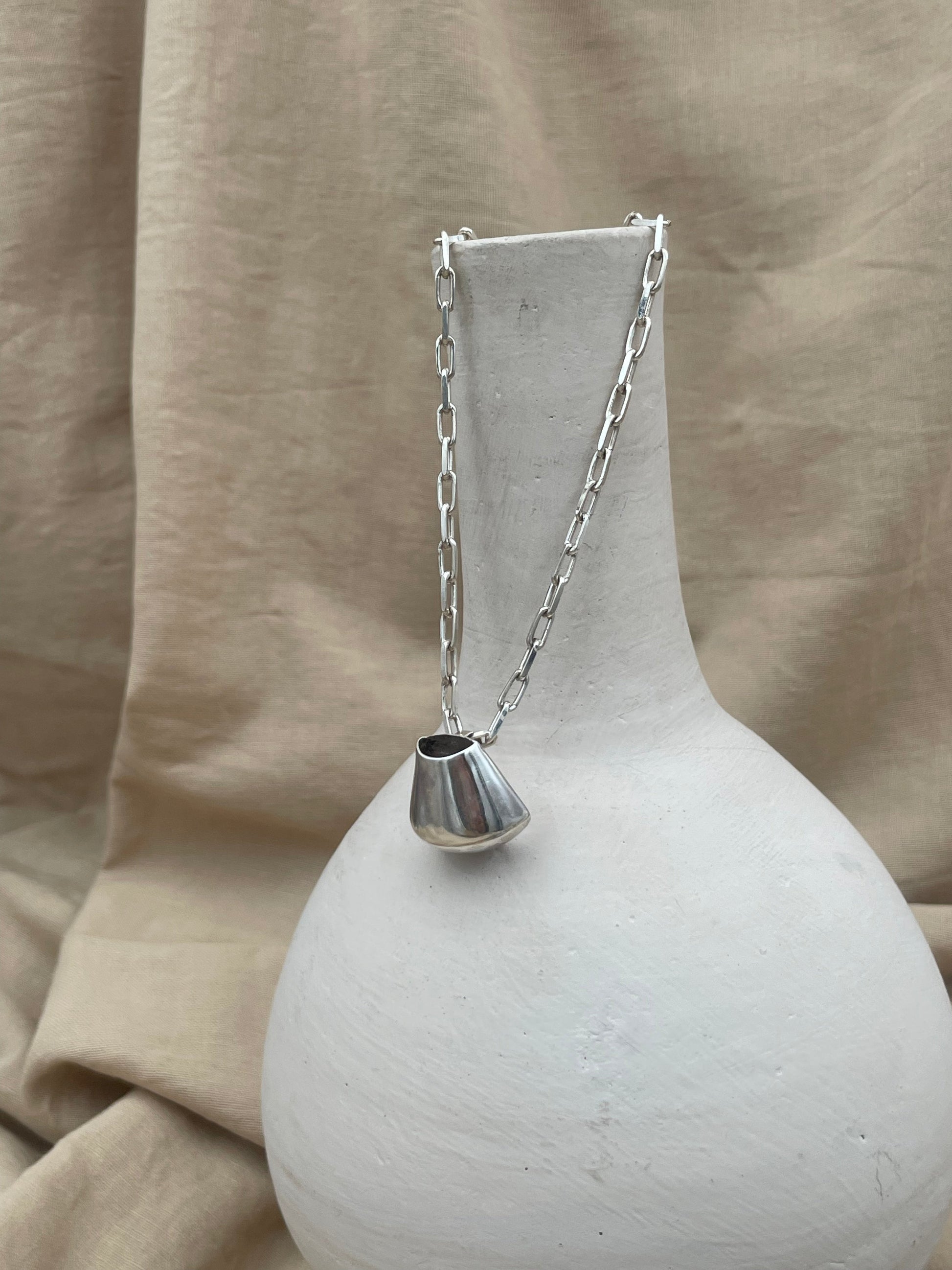An ode to metalsmithing and pottery forms, the bubble container swings back and forth, reflecting its surroundings and casually revealing its hollow nature.