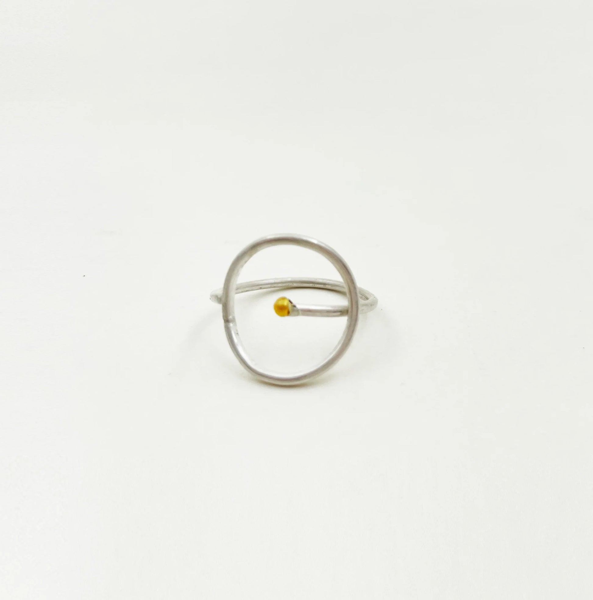 The 'Saturn ring' is a handmade sterling silver circular ring with a plated centre orb.